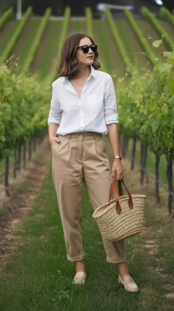 A white button-down and tailored neutral trousers create a timeless silhouette suited for countryside settings. Loafers add comfort, while a woven bag introduces texture. This Essential Spring Vacation outfit feels composed and practical, allowing the location to take center stage rather than the clothes.