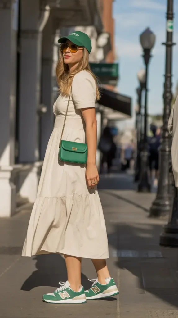 Comfort leads the way in this relaxed yet charming outfit built around a neutral midi dress and sneakers. The silhouette feels breathable and easy, ideal for long walks and warm afternoons. Soft green accents add freshness without overpowering the look, making it a strong Essential Spring Vacation option for destinations where practicality matters. The combination feels modern and approachable, with simple layers allowing flexibility as the day’s temperature changes.