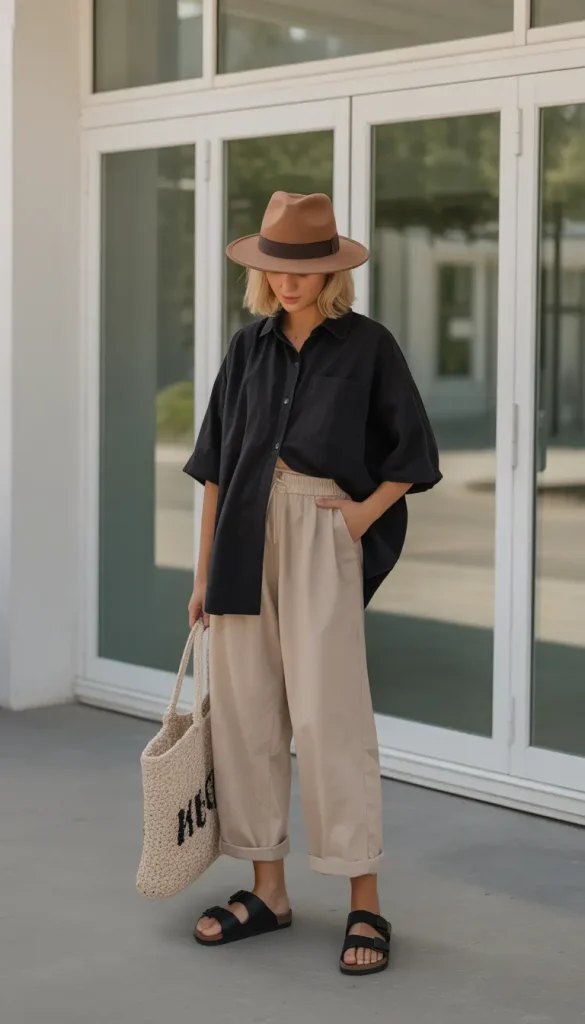 Neutral trousers paired with a loose black shirt create a calm, grounded outfit that adapts easily from day to evening. Flat sandals maintain comfort, while a straw bag keeps the look seasonal. As an Essential Spring Vacation style, it reflects simplicity and ease, closing the trip with a relaxed, confident feel.