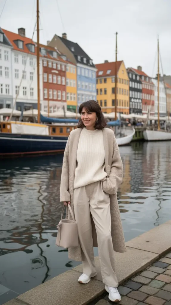 Layered neutrals create a calm, thoughtful outfit suitable for cooler spring climates. A knit sweater provides warmth, while relaxed trousers ensure comfort for long walks. A cardigan adds versatility for changing weather, making this a dependable Essential Spring Vacation choice for northern destinations. The neutral palette keeps the look understated and adaptable.