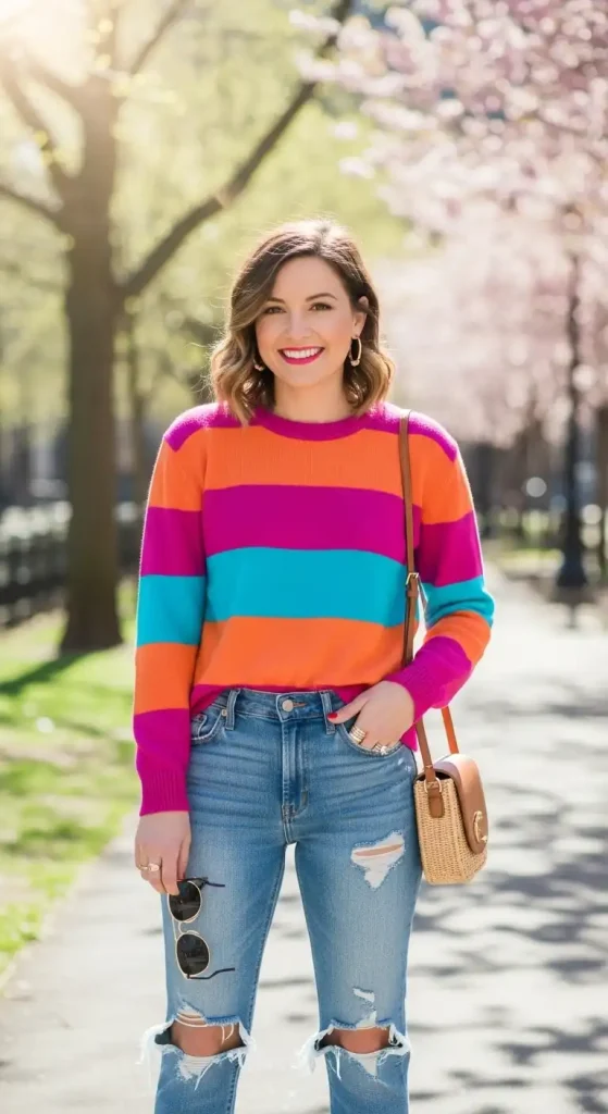 A chunky striped sweater with ripped jeans blends playful preppy elements with casual edge. Half-tucking the sweater adds a relaxed, put-together vibe.