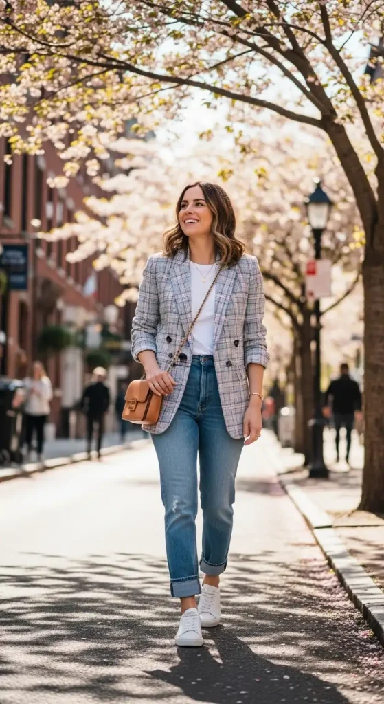 A plaid blazer instantly elevates a simple tee-and-jeans outfit. It adds structure, polish, and color coordination opportunities with shoes or bags.