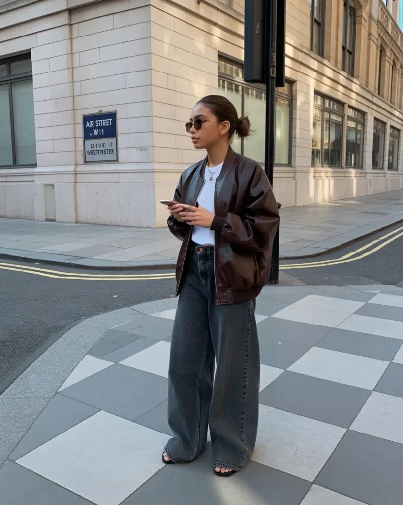 A bomber jacket paired with wide-leg jeans defines this modern February outfit idea. The look feels grounded, practical, and easy to wear.