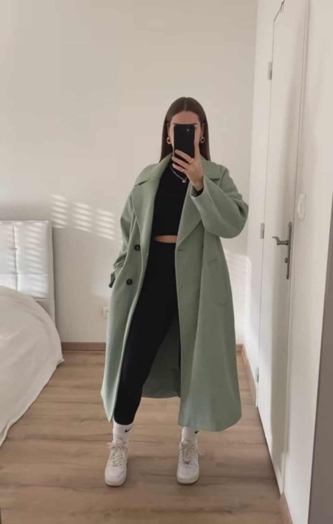 A long green coat throws a chic layer over simple athleisure, proving sporty pieces can still look put-together.