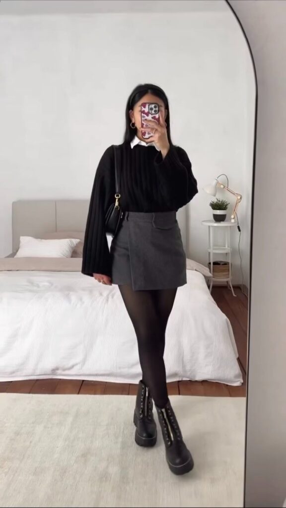 The cropped sweater with a collar detail and short skirt gives off a preppy-meets-trendy vibe that’s easy to style for fall days.