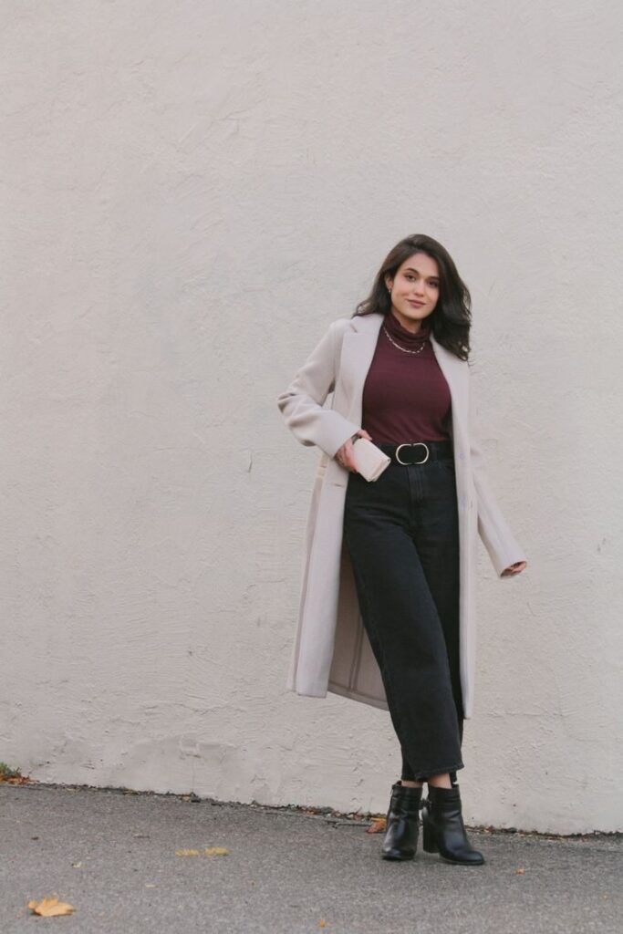 The cream coat and deep burgundy knit create a rich contrast, making the outfit look polished without much effort.