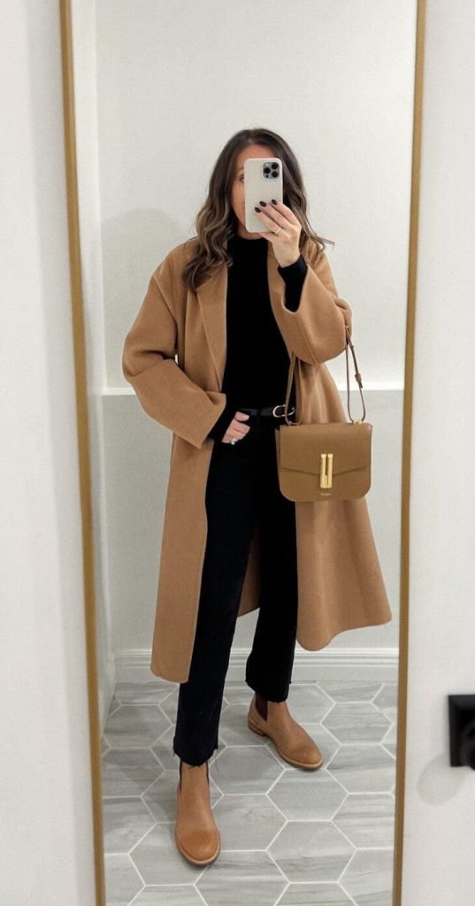 A camel coat instantly upgrades black staples underneath, giving off a timeless, classy vibe.