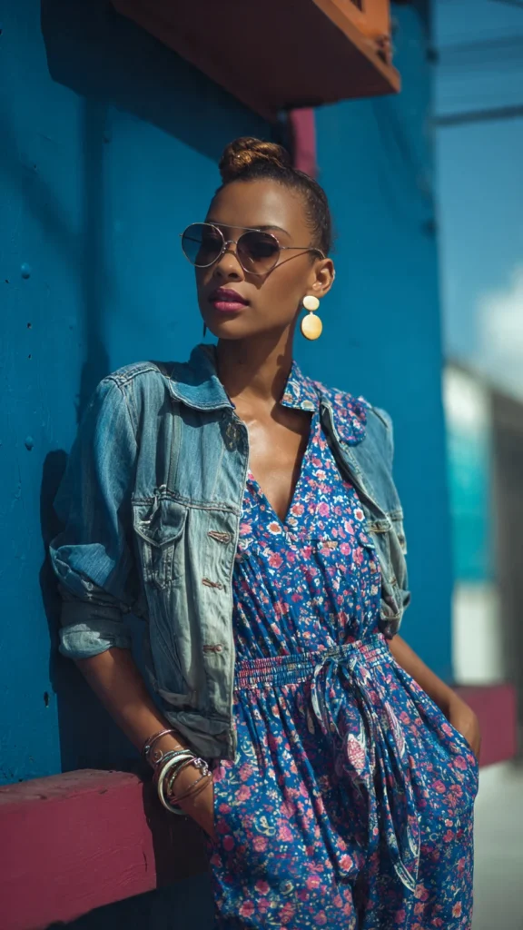 A denim jacket introduces light structure without overpowering the outfit. It balances softer or flowy fabrics and makes the overall look feel grounded. This pairing works especially well during transitional weather when temperatures fluctuate throughout the day.