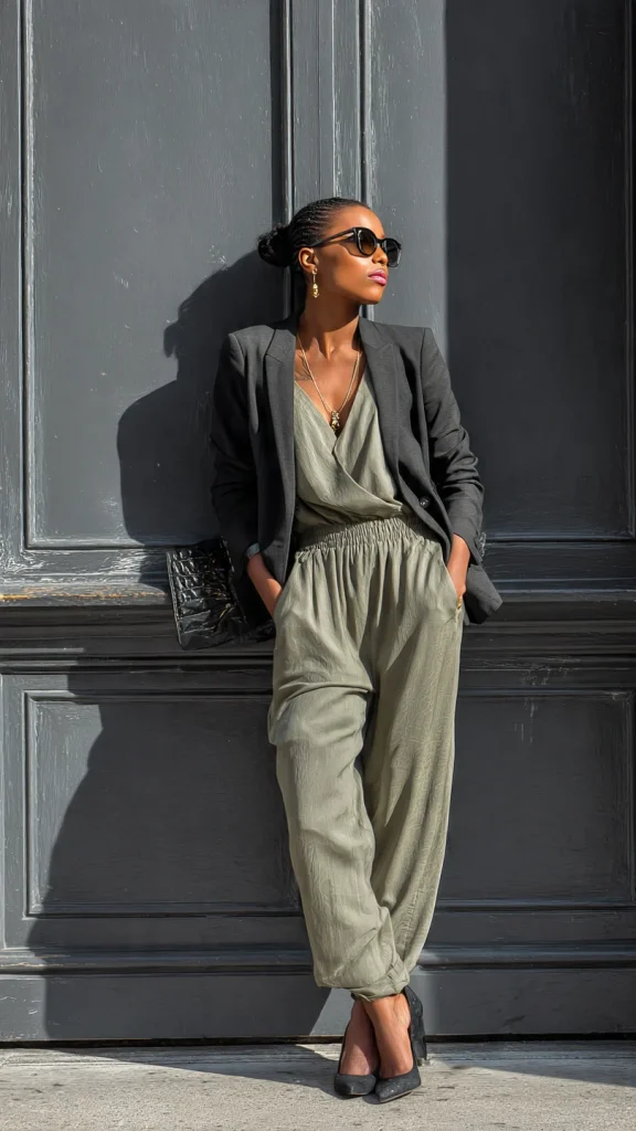 A blazer sharpens the overall appearance and adds a professional edge. The jumpsuit keeps the outfit current and less predictable than traditional office attire. Together, they create a balanced look that feels polished without being overly formal.