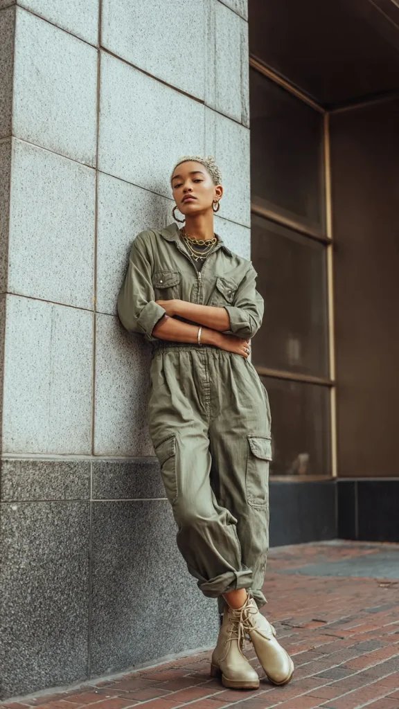 Utility designs often feature structured lines and functional details that stand out on their own. Keeping accessories minimal allows the jumpsuit’s shape to remain the focus. It is comfortable enough for all-day wear and works well in casual settings.