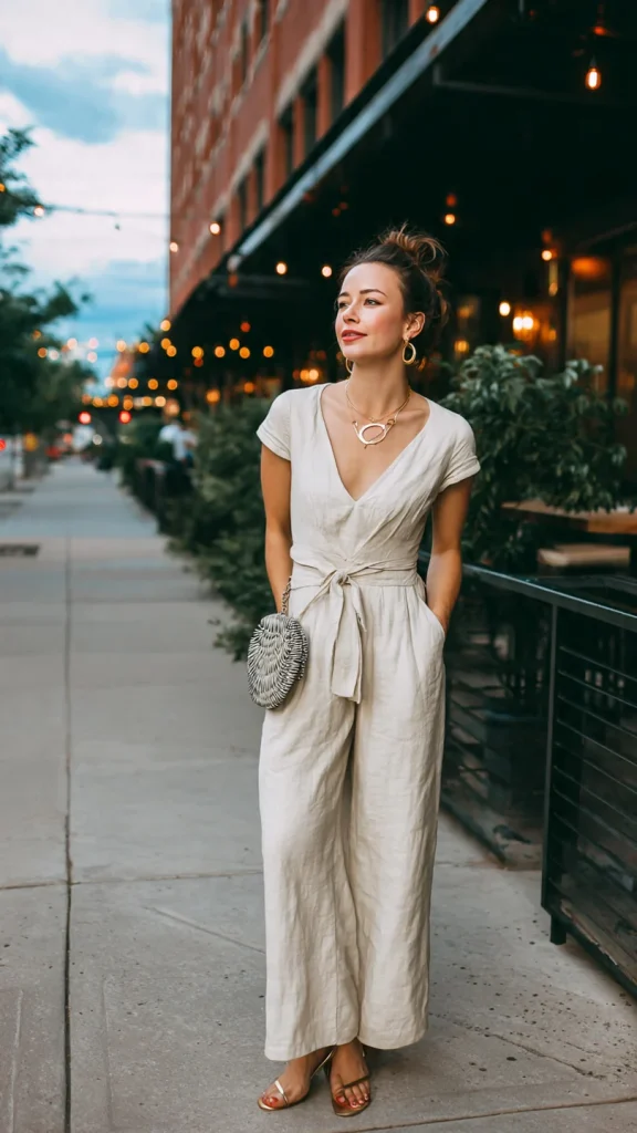 Neutral shoes, subtle jewelry, and a structured bag complement the jumpsuit without competing with it.