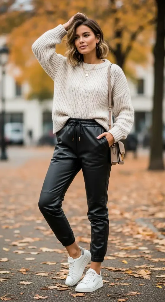 Leather joggers paired with a chunky knit sweater create a mix of comfort and luxe appeal. This combination is ideal for transitional seasons, providing warmth while looking intentional and stylish.