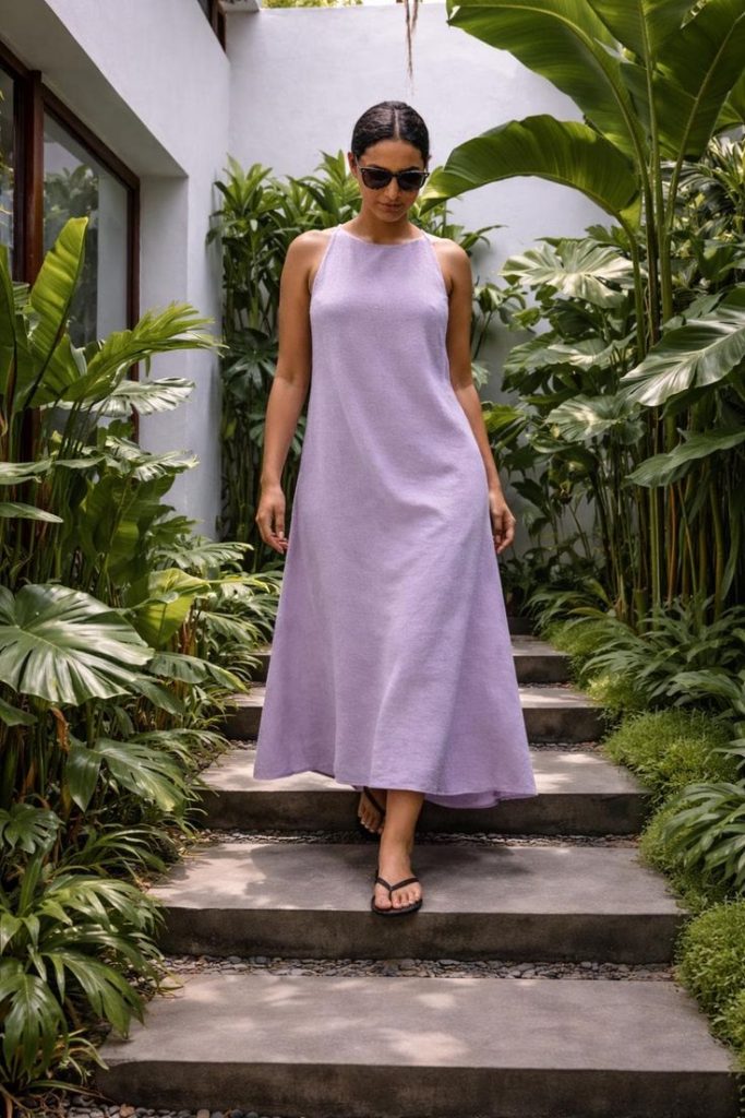 A linen-blend dress brings natural texture and breathability, making it ideal for a laid-back brunch atmosphere. The fabric feels easy and comfortable while still looking intentional and well-chosen.