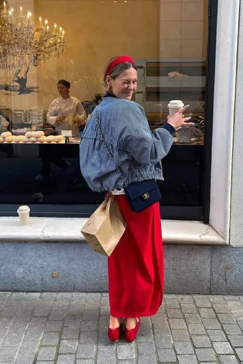 This look focuses on coordinated color to create a romantic and elegant Valentine’s Day Outfit. The red headband and long skirt work together to form a cohesive style. The outfit feels expressive without being overwhelming.