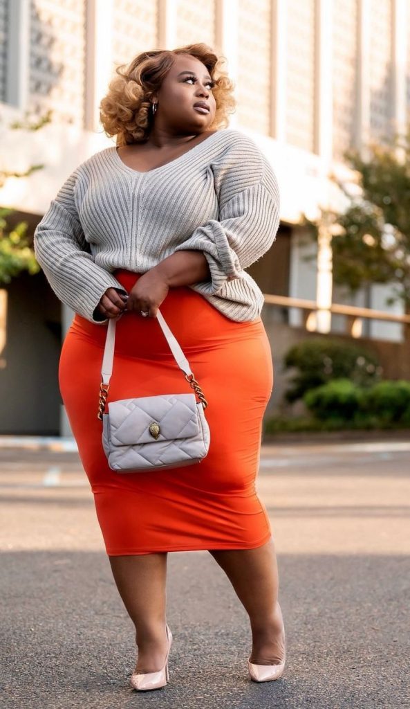 This Plus Size Outfit highlights soft femininity with a bold twist. A warm-toned sweater brings comfort and richness, while a leather skirt adds movement and texture. The combination feels playful yet refined, making it suitable for seasonal gatherings or evening celebrations. Thoughtful accessories and layered details elevate the look without overpowering it.