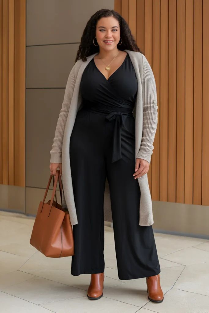 A jumpsuit-based Plus Size Outfit offers simplicity with strong visual impact. The wrap-style design enhances curves, while layered outerwear adds structure and dimension. This outfit is an easy choice for events that call for effortless sophistication.