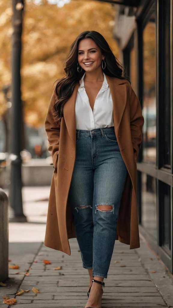 A structured coat transforms this Plus Size Outfit into a polished ensemble. Paired with distressed denim, the contrast between tailored and casual pieces creates a balanced look that works well for everyday outings or casual dinners.