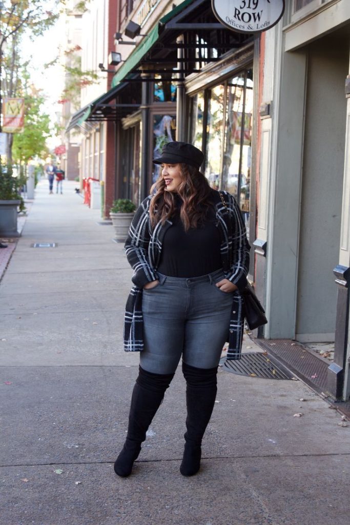 Plaid elements add texture and personality to this Plus Size Outfit. Dark denim paired with a fitted top creates a strong base, while structured outerwear and tall boots introduce edge and confidence. This look feels bold yet wearable for seasonal outings.