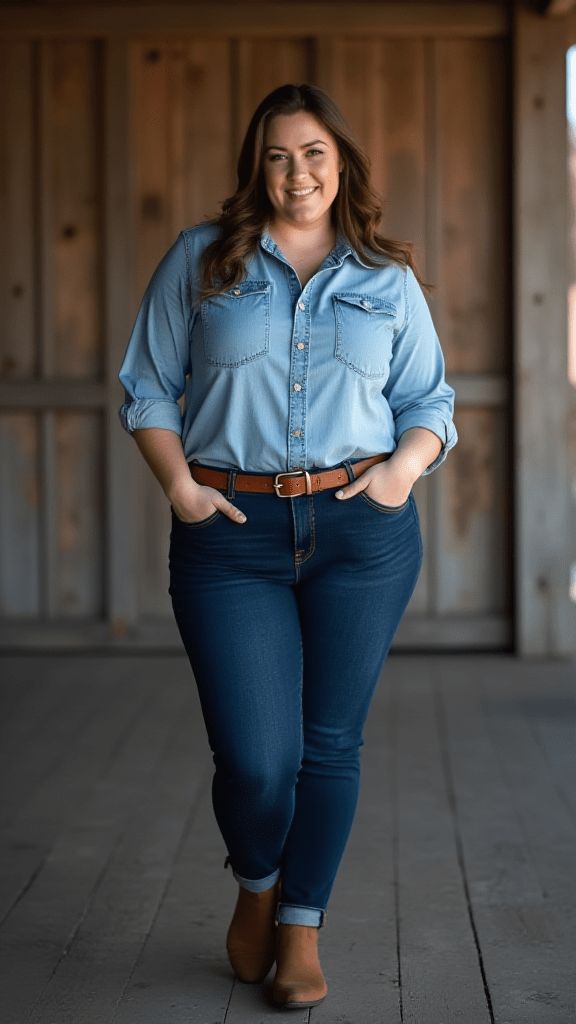 This Plus Size Outfit proves that denim layering can be both stylish and flattering. Coordinated denim pieces create a streamlined effect, while subtle accessories add contrast and definition. It’s a practical yet fashionable choice for casual days.