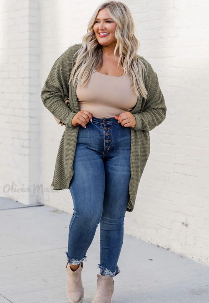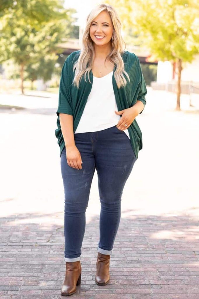 A layered Plus Size Outfit like this balances comfort and style with ease. Dark jeans paired with a simple base top are elevated by a flowing cardigan, creating a look that feels relaxed, warm, and thoughtfully styled.
