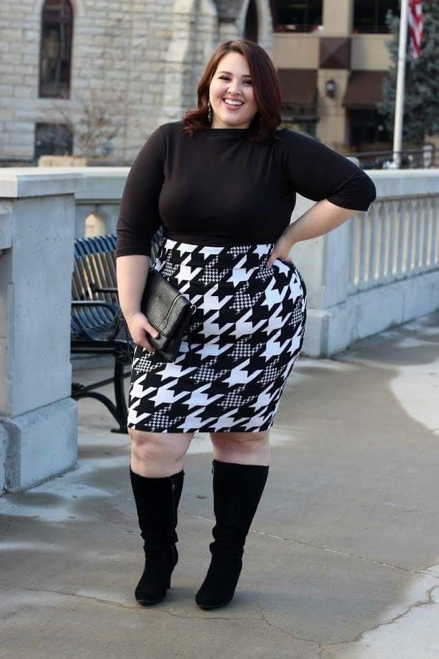 A classic black-and-white Plus Size Outfit offers timeless appeal with minimal effort. Pairing a patterned pencil skirt with a fitted top creates a refined silhouette that works well for offices, dinners, or formal daytime events. The neutral color palette keeps the look sophisticated, while structured accessories and tall boots add polish and balance to the overall outfit.