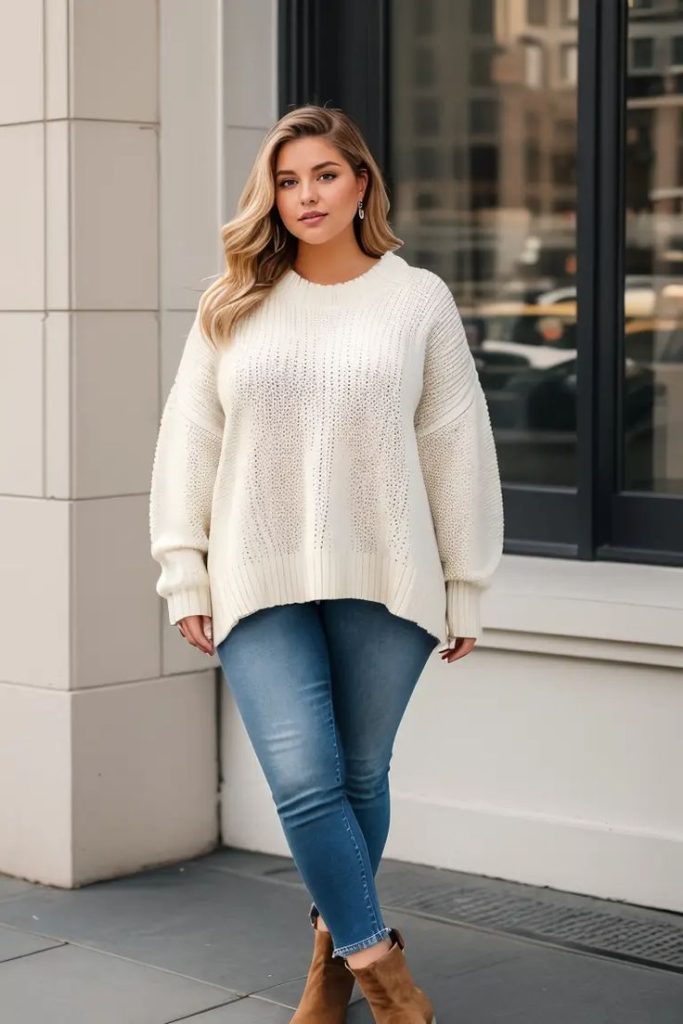 Soft neutrals give this Plus Size Outfit a refined and versatile feel. A light sweater paired with denim creates a clean silhouette that transitions easily between casual and semi-dressed settings, making it a reliable wardrobe option.