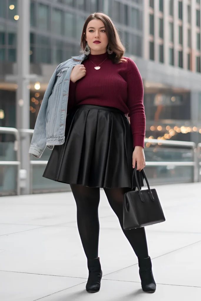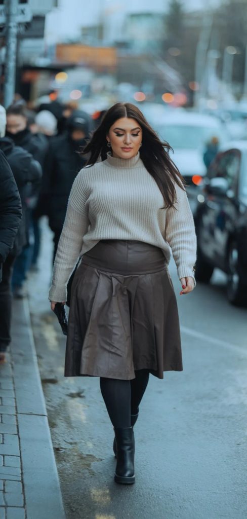 A cozy knit sweater paired with a leather skirt creates a refined winter Plus Size Outfit that feels both warm and elegant. The contrast between soft and structured fabrics enhances the overall silhouette, making this look suitable for formal gatherings, dinners, or seasonal celebrations.