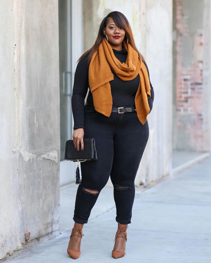 An all-black Plus Size Outfit serves as a sleek foundation, allowing statement accessories to shine. Dark denim and a fitted top create a streamlined shape, while a contrasting scarf adds warmth and visual interest. This outfit feels relaxed yet intentional, making it a strong choice for casual outings that still call for a stylish appearance.