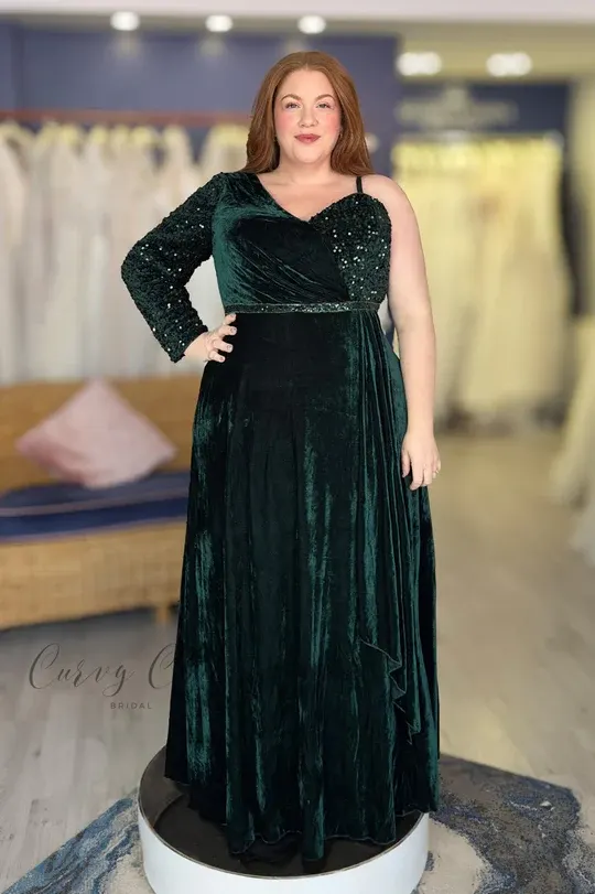 An emerald velvet gown creates a rich and memorable impression at formal celebrations. The one-shoulder design introduces modern elegance, while a sparkling sleeve detail adds contrast and visual interest. The velvet fabric drapes smoothly, offering both comfort and lengthening effect through the body. Ideal for evening or winter weddings, this gown delivers depth, texture, and sophistication. When paired with subtle accessories, it becomes a striking highlight within PLUS-SIZE WEDDING GUEST OUTFITS designed for upscale occasions.