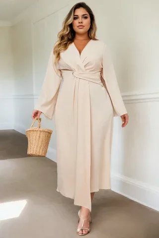 A neutral wrap dress is a dependable choice for guests who appreciate understated style. The wrap front shapes the waist comfortably, and the soft draping flatters without clinging. Long sleeves add a refined touch, making it suitable for semi-formal or indoor events. Accessories in complementary tones complete the look while keeping it cohesive. This type of dress easily adapts to different settings, reinforcing its place among classic PLUS-SIZE WEDDING GUEST OUTFITS for any season.