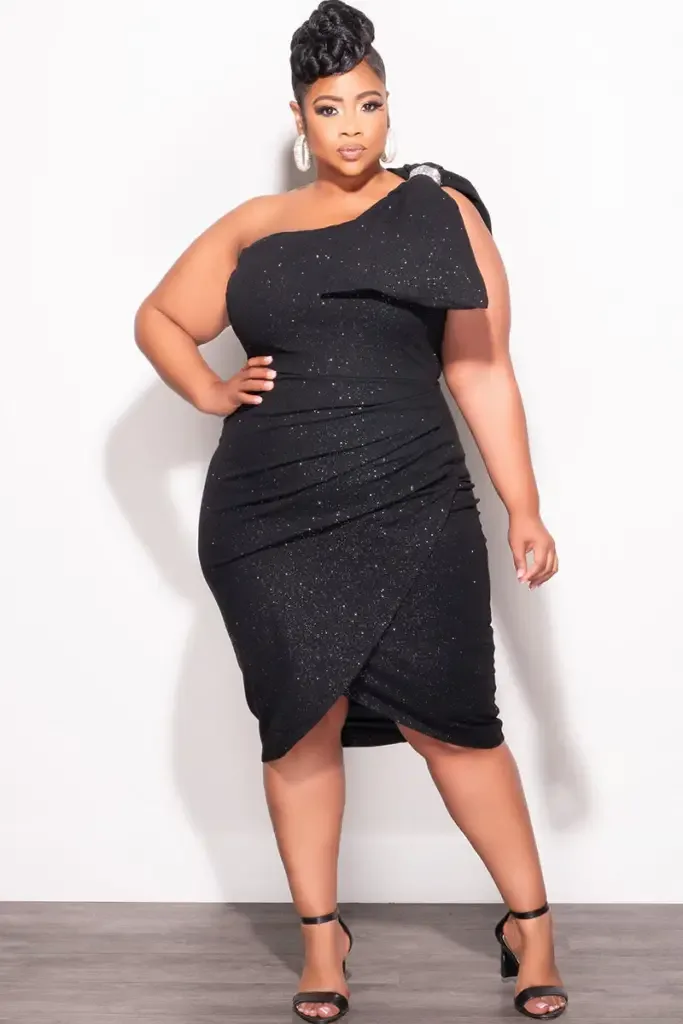 A one-shoulder black dress with subtle shimmer works beautifully for evening weddings. The asymmetrical neckline adds interest and draws attention upward, while the fitted bodice enhances natural curves. Gentle ruching and a wrap-style skirt create a smooth, flattering shape. The midi length keeps the look appropriate while still feeling stylish. Paired with coordinating heels and simple accessories, this outfit offers understated glamour. It is a reliable choice in PLUS-SIZE WEDDING GUEST OUTFITS when the dress code leans formal and refined.