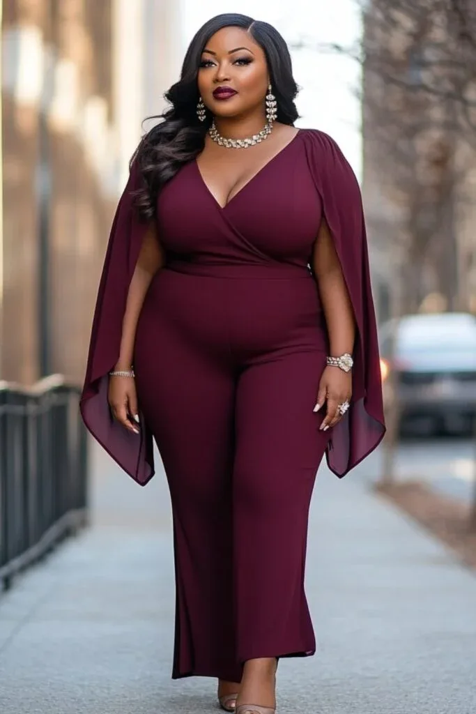 A burgundy jumpsuit offers a refreshing alternative to traditional dresses. The wrap-style top shapes the neckline attractively, and a defined waist paired with wide legs creates a long, streamlined effect. The cape sleeves introduce movement and drama while still providing coverage. Styled with simple heels and statement jewelry, the look feels polished and distinctive. For guests who prefer tailored pieces over dresses, this jumpsuit stands out among PLUS-SIZE WEDDING GUEST OUTFITS as both modern and sophisticated.