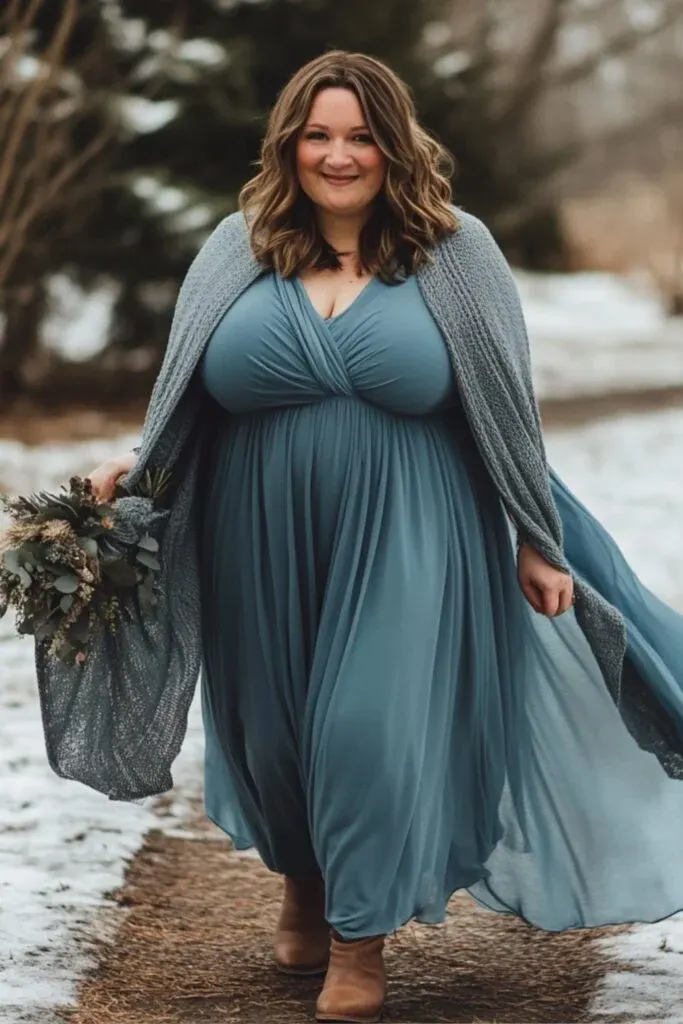 A dusty blue gown paired with a shawl is a practical yet beautiful option for winter celebrations. The softly gathered bodice adds texture and enhances curves, while the flowing skirt brings a romantic quality to the overall silhouette. Layering with a textured wrap provides warmth without taking away from the gown’s elegance. Comfortable footwear ensures ease when navigating outdoor or seasonal venues. This combination proves that PLUS-SIZE WEDDING GUEST OUTFITS for colder months can remain stylish while offering comfort and coverage.