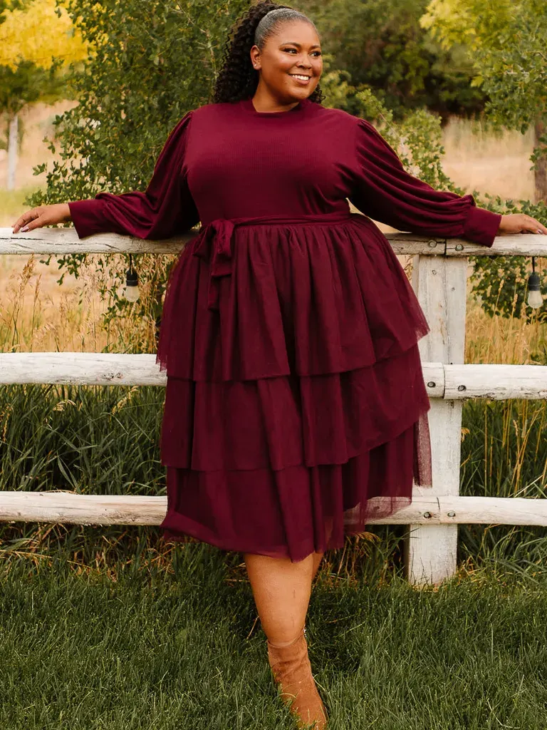 A tiered burgundy dress offers comfort and charm, especially for fall or countryside weddings. The layered skirt creates soft volume and graceful motion, while long sleeves provide balance and seasonal appropriateness. A waist tie gently shapes the figure without feeling restrictive. The high neckline keeps the overall look polished and suitable for more traditional settings. Styled with neutral boots or simple heels, the outfit feels relaxed yet thoughtful. This style highlights how PLUS-SIZE WEDDING GUEST OUTFITS can blend ease and elegance in equal measure.