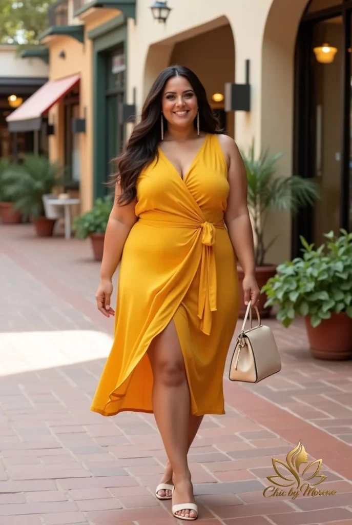 A mustard wrap dress is a bright and cheerful choice for warm-weather celebrations. The wrap design naturally defines the waist and creates a flattering hourglass effect, while a deep neckline elongates the upper body. An asymmetrical hem adds flow and makes the dress feel light and easy to wear, especially for outdoor ceremonies. Paired with understated sandals and a neutral handbag, the bold color remains the focus. Simple styling keeps the overall appearance elegant without feeling overdone. For guests seeking something lively yet refined, this dress stands out among PLUS-SIZE WEDDING GUEST OUTFITS for summer weddings.
