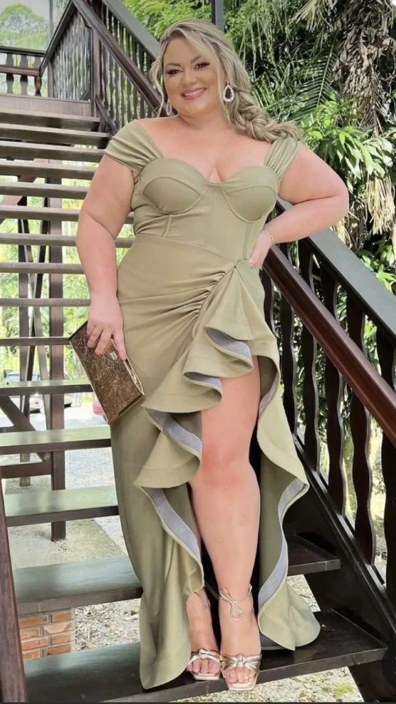A sage green gown brings a refined and elevated feel to formal or semi-formal weddings. The structured bodice shapes the upper body beautifully, offering support while highlighting the neckline and shoulders. A cascading ruffled slit adds dimension and movement, giving the gown a dramatic yet tasteful edge. The muted green shade feels modern and versatile, making it suitable for garden settings, destination weddings, or elegant evening venues. Paired with metallic heels and a sleek clutch, this gown delivers a confident, upscale appearance that fits perfectly within curated PLUS-SIZE WEDDING GUEST OUTFITS for more formal occasions.