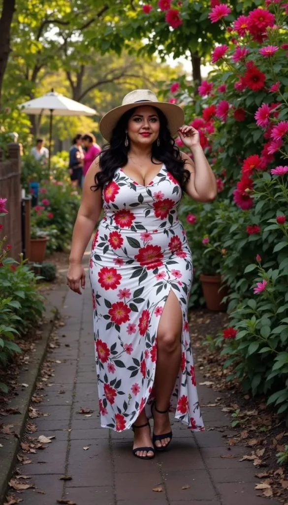 A white floral maxi dress with a side slit feels especially fitting for outdoor or garden weddings. The tailored fit highlights curves in a smooth, confident way, while colorful floral prints add brightness and charm. A V-neckline softens the overall design, and the slit along the leg allows easy movement while adding a subtle touch of allure. Simple sandals and statement earrings keep the outfit balanced and refined. A wide-brim hat can elevate the look further, offering both style and practicality for sunny daytime ceremonies. This type of flowing maxi remains a favorite in PLUS-SIZE WEDDING GUEST OUTFITS for warm-weather events.