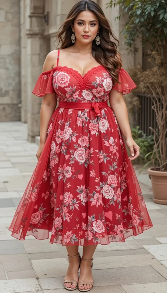 A red floral midi dress offers a classic yet eye-catching option for wedding guests who want something romantic and feminine. The sweetheart neckline gently frames the upper body, while lace accents add a delicate touch. Off-shoulder flutter sleeves introduce soft movement, giving the outfit a light and graceful feel. The fitted top flows into an A-line skirt decorated with floral patterns, creating shape at the waist and allowing the fabric to move freely. A sash belt helps define the silhouette for a balanced finish. Styled with neutral heels and bold earrings, this look works beautifully for spring and summer celebrations and remains a standout choice among PLUS-SIZE WEDDING GUEST OUTFITS.