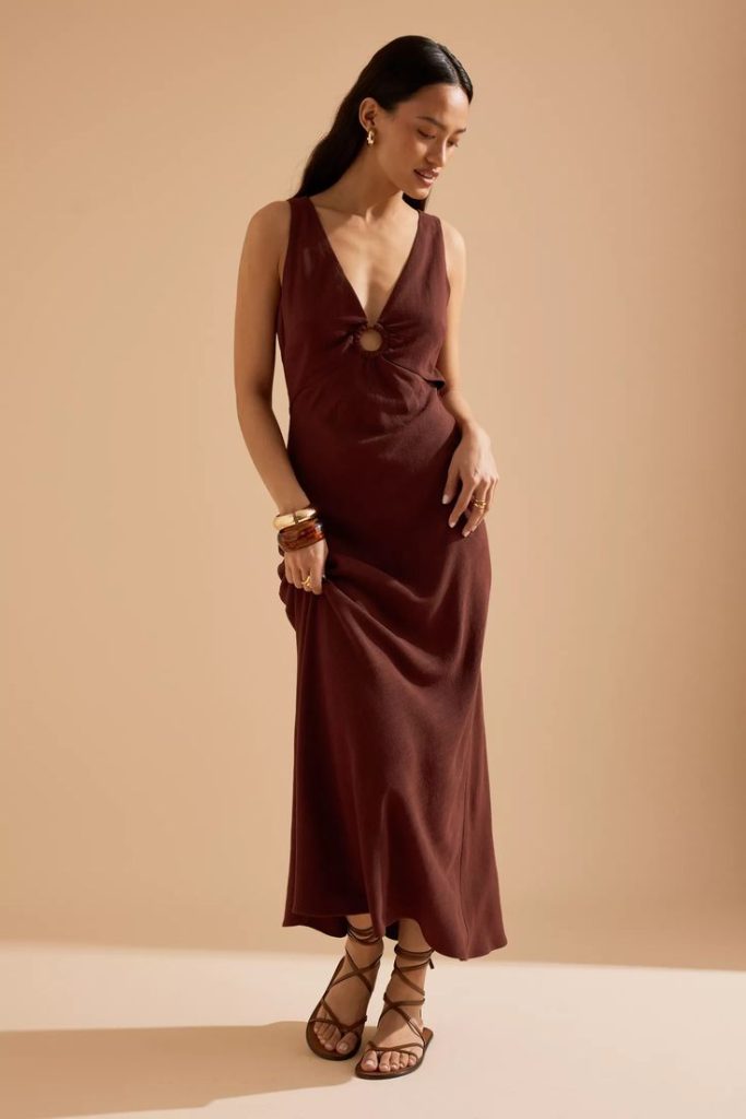 A linen-blend dress introduces texture, creating a grounded and honest look under natural light. Minimal detailing and clean seams maintain an intentional appearance without feeling formal.