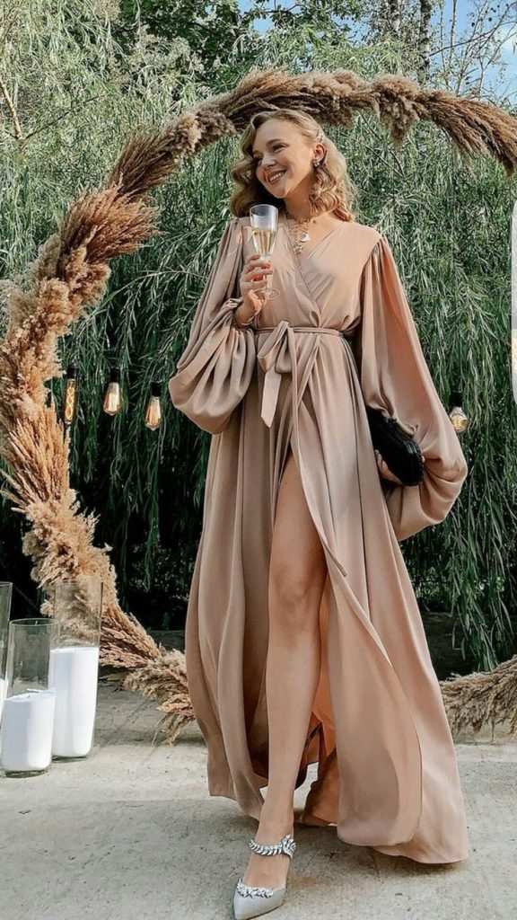 Wrap dresses in colors such as sage, dusty blue, or soft terracotta blend seamlessly with rustic environments. The wrap style offers movement and flexibility for walking, sitting, and dancing.