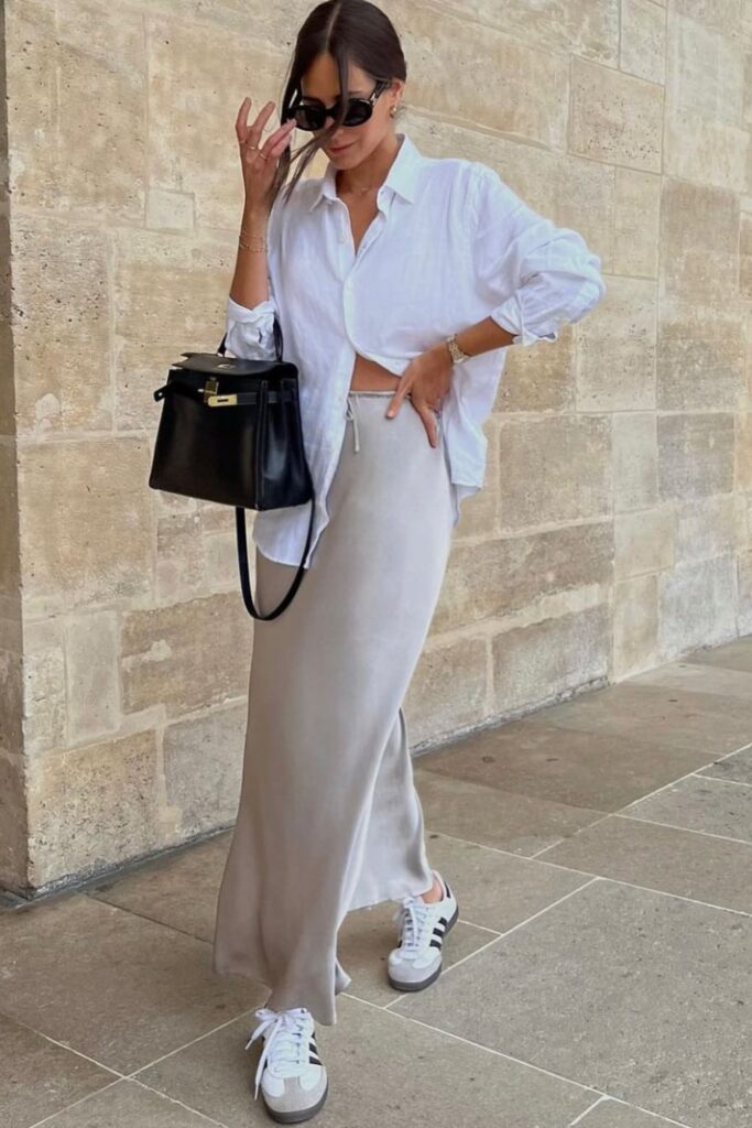 Button-down shirts never fail, and with a satin skirt they look even better. Gray and white is a simple combo, and sneakers keep it from looking too serious.