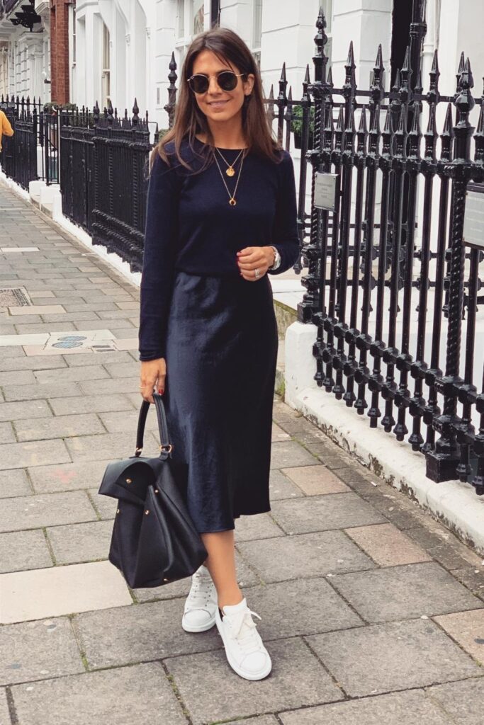 The satin skirt is basically a wardrobe shortcut — it makes even the most basic top look polished. Whether you’re leaning casual with sneakers and a tee or dressed up in heels and a blazer, the skirt pulls the whole outfit together.