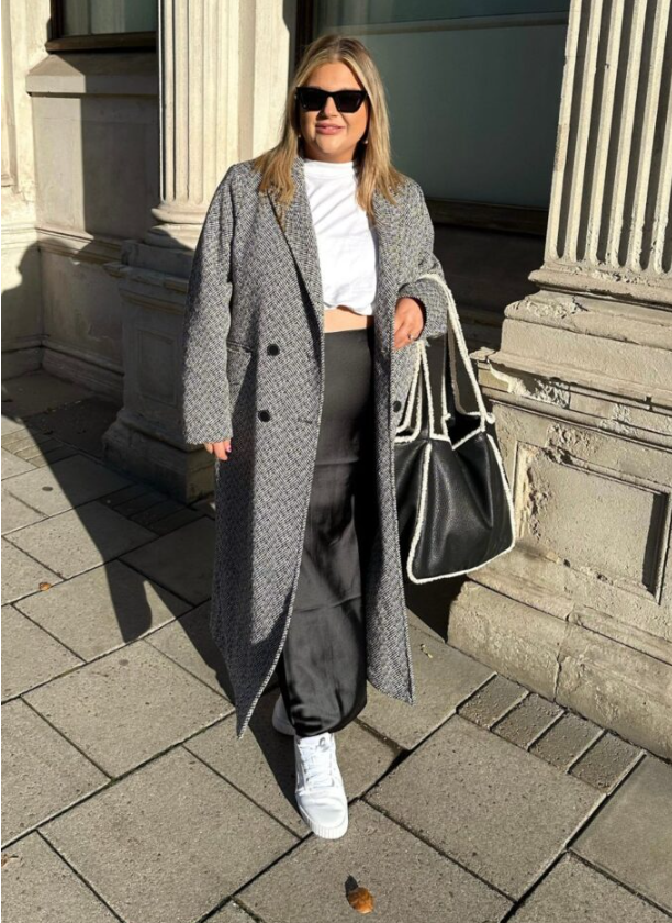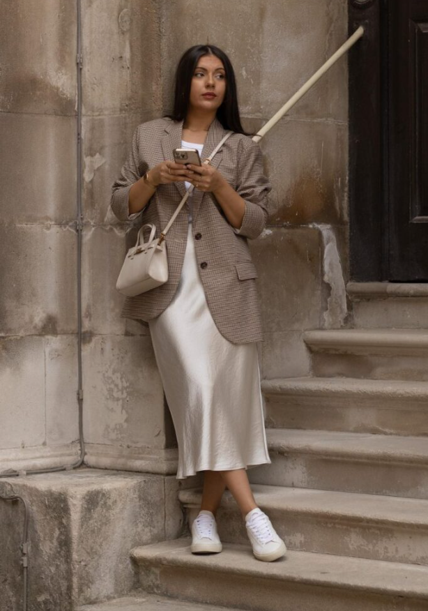 A checkered blazer over a white satin skirt just works — sharp on top, soft and flowy on the bottom. Toss in sneakers and a small bag and you’re set for the office or brunch.