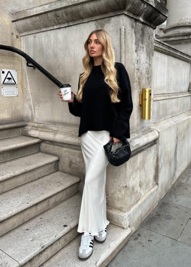 Black Oversized Sweater and White Satin Skirt