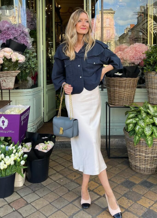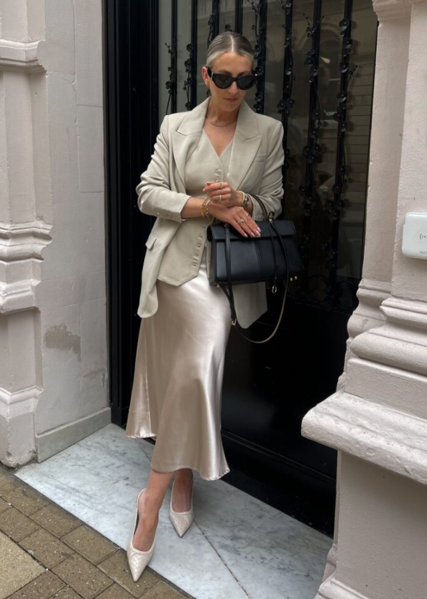 Head-to-toe cream is sleek and powerful. A satin skirt adds movement, while heels and a structured bag keep it sharp.