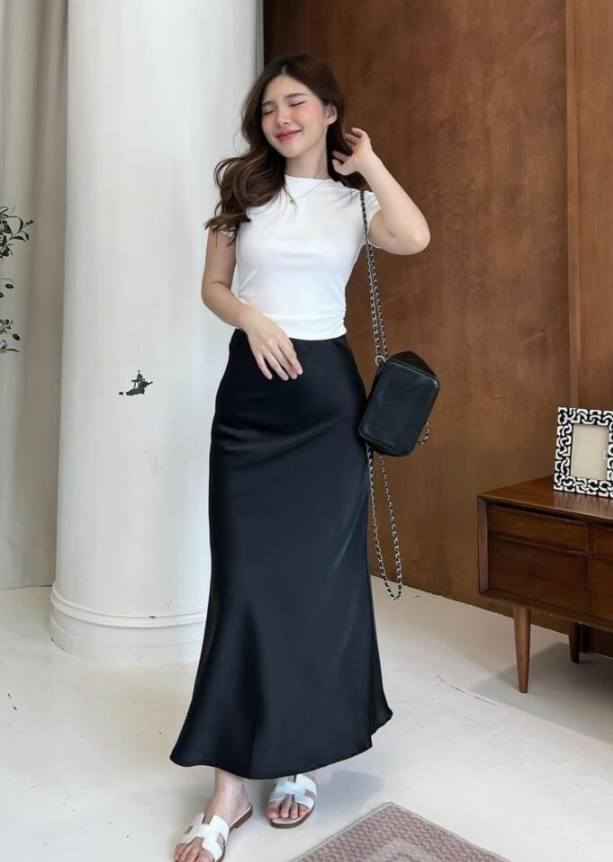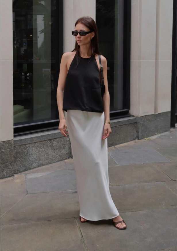 The black-and-white combo never fails. A plain tank and a satin skirt — simple, airy, and perfect for summer days.