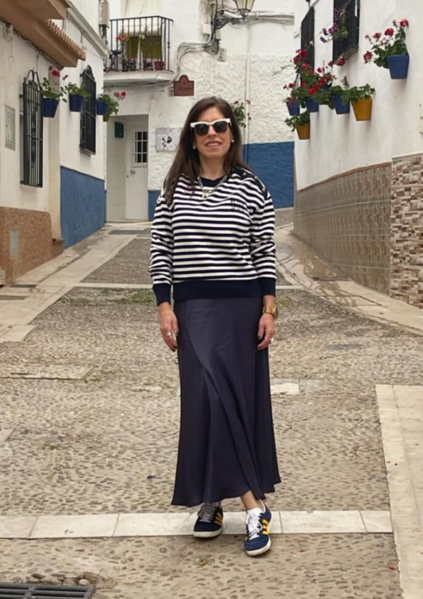 Stripes on top, flowy satin on the bottom — the contrast makes it fun. Bright sneakers stop the outfit from feeling stiff, and shades tie it all together.