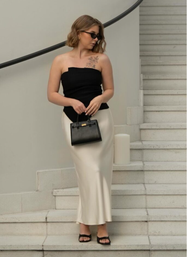 Black strapless top, cream satin skirt — light meets dark, casual meets chic. Add sandals and a bag, and you’ve got a day-to-night outfit.