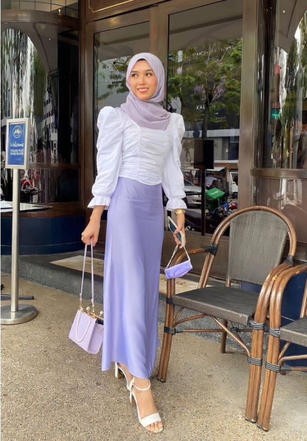 Light puff sleeves with a lavender skirt scream spring. Strappy sandals and a matching bag keep the outfit soft and playful.