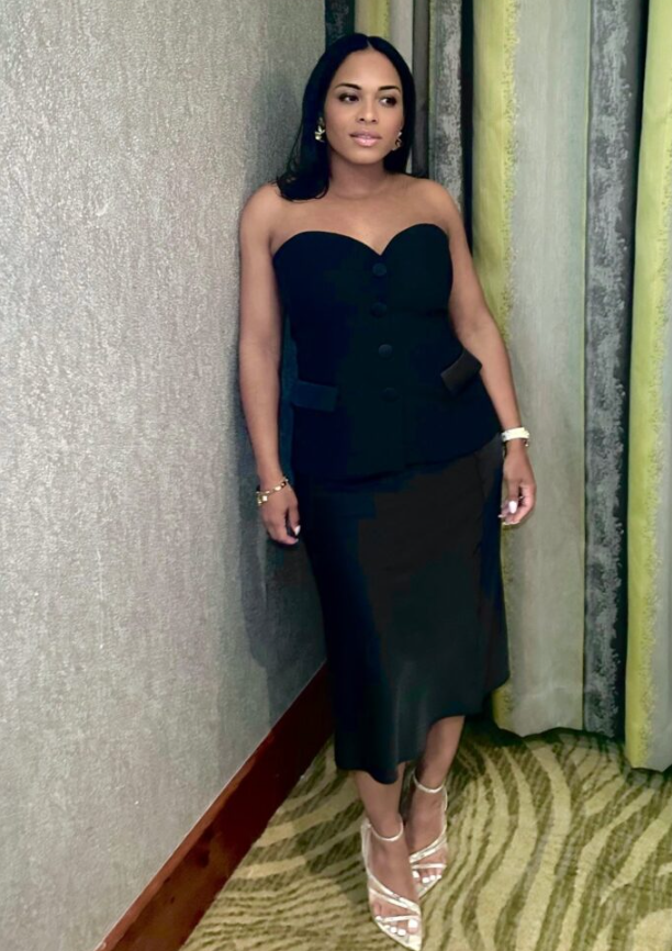 Strapless vest top, fitted satin skirt — sleek and flattering. Strappy heels give height and keep the outfit elegant without being too much.